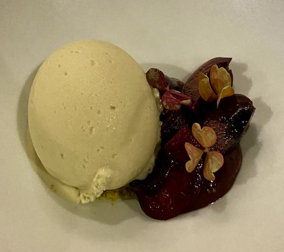 피스타치오 아이스크림에 체리 퓨레를 곁들인 디저트입니다.